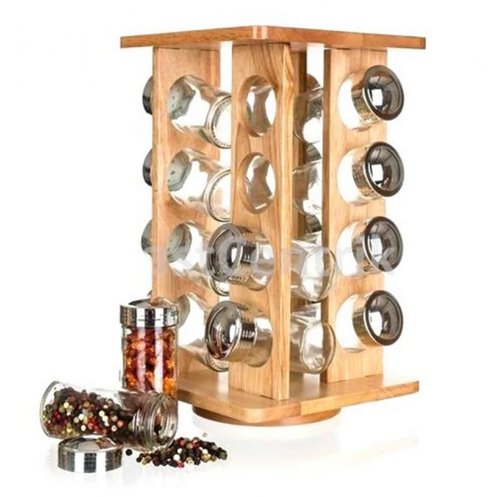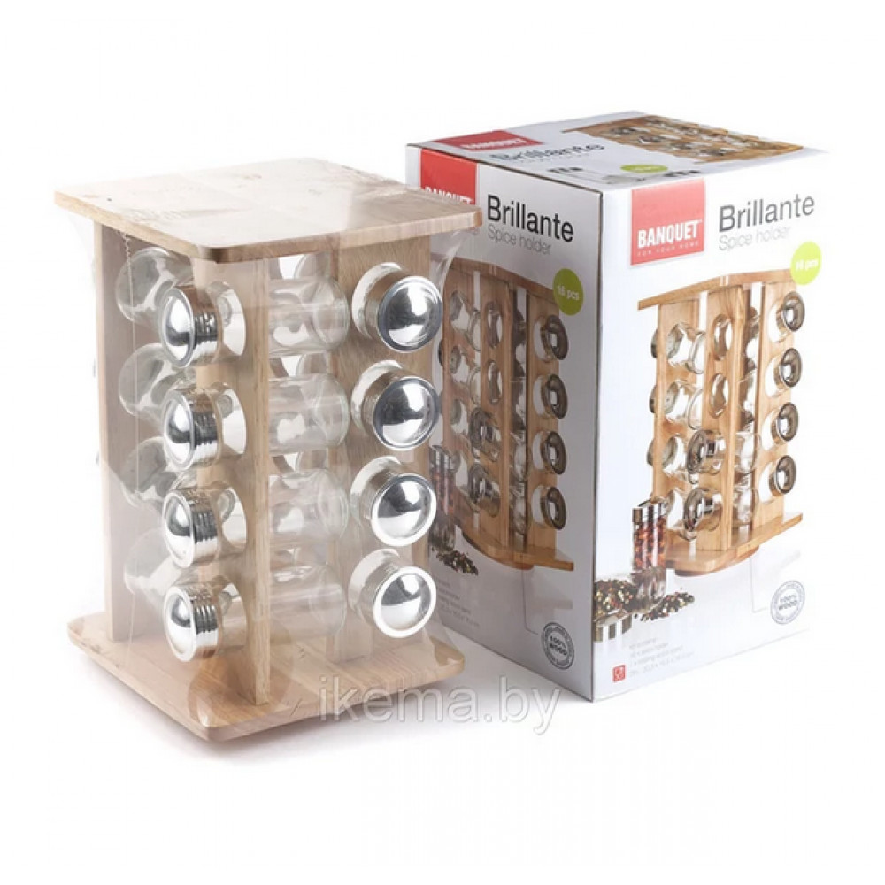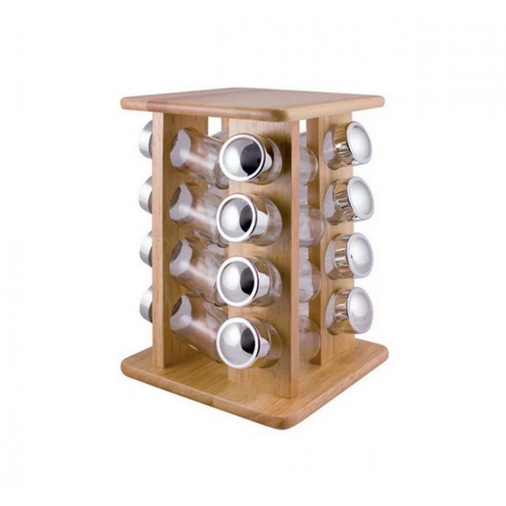 A 16 részes Brillante fűszertartó készlet tartalma: 16 db üveg fűszertartó krómozott felületkezelésű műanyag fedéllel, 1 db 16,5 x 16,5 x 30,3 cm-es forgatható fa állvány.